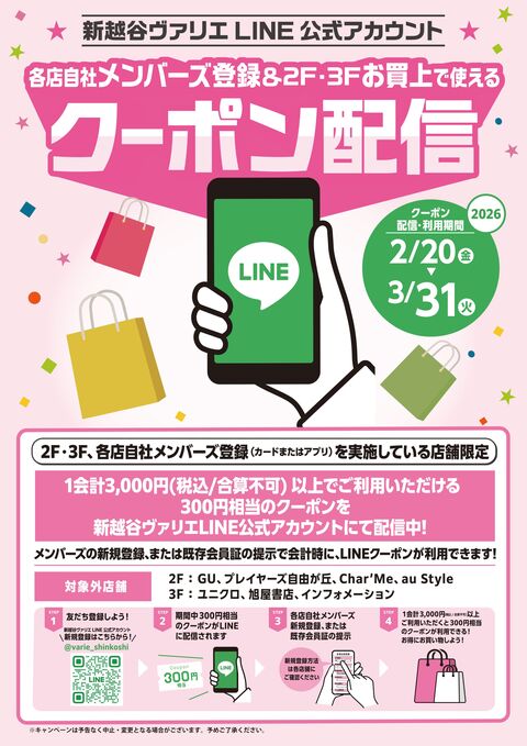 1会計3,000円以上(税込/合算不可)で使える300円相当のクーポンを新越谷ヴァリエLINE公式アカウントにて配信中!
