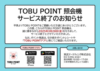 TOBU POINT 照会機は、誠に勝手ながら2025年3月28日(金)をもちまして、サービス終了とさせていただきました。